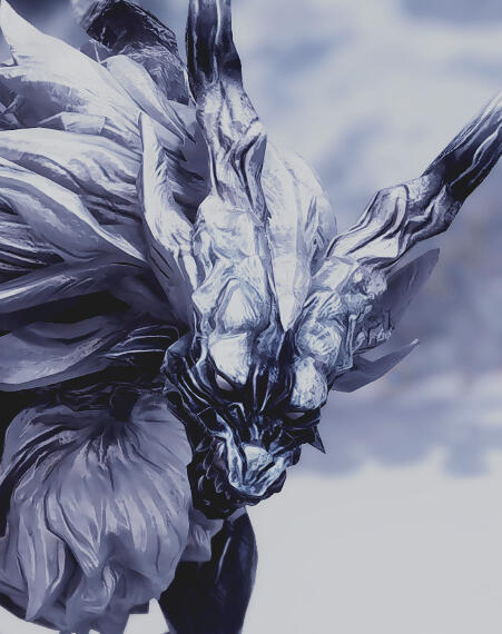 ㅤLoyal to none save you and yours.ㅤㅤHis voidsent avatar embodies the desolation of ice and the untamed savagery of wolves. Its form, reminiscent of a malformed hoarhound, stands tall, its limbs and clawed extremities exuding a predatory presence. Jagged fur encrusted with ice veils its body, adorned with rune-like etchings that pulsate ominously and resemble Skadi's own tattoos. The maw, lined with glacial fangs, radiates with a ghostly luminescence and nine spectral tails swirl around Garmr. It is untrusting of strangers, a trait influencing Skadi's behaviour and therefor creating a shared sense of mistrust in the world.